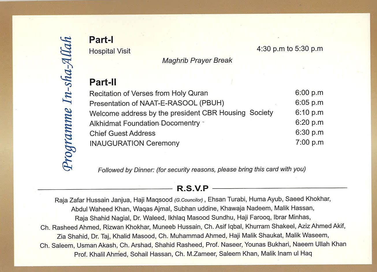 Performed by Raja Khurram Shahzad Nawaz, Chairman National Assembly Standing Committee on Interior & Mr. Amer Ali Ahmed, Chief Commissioner / Chairman CDA, Islamabad. Executed by Mr. Altaf Ahmad Bhat, President CBR ECHS, Islamabad.